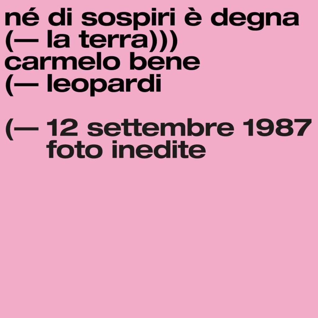 12 Settembre 1987: Invitato dal comune di Recanati a recitare i Canti di Giacomo Leopardi in piena piazza, Carmelo Bene accetta di buon grado tuttavia col “rifiuto del portar la voce”, declinando cioè la recita, il recital, l’asciutta parte di “cantor vago”, con la premessa di dare corpo piuttosto che voce e vocalizzo ai versi del poeta.