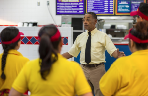 Tornando a Better Call Saul (di seguito BCS), l’intera serie tv è un invito a problematizzare i valori che stanno dietro il sogno. Nella terza stagione Gus Fring, il proprietario della catena di fast food “Los Pollos Hermanos”, intende tranquillizzare suoi dipendenti, terrorizzati dai loschi personaggi che il giorno precedente si sono presentati nel locale (Fig. 1).
