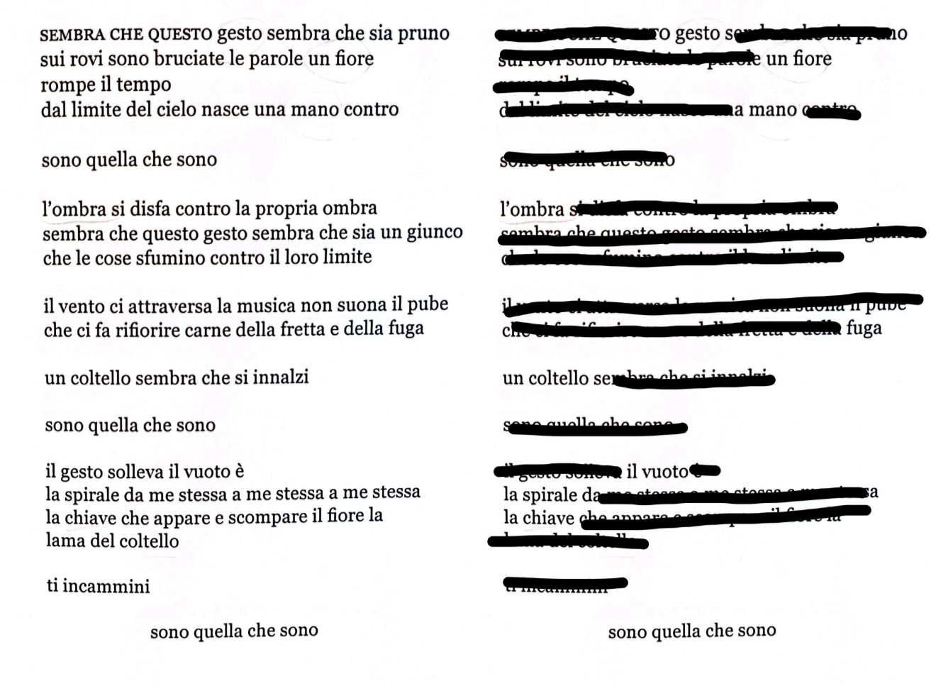 Procedere a cancellare (male) parti di uno dei primi testi di Nostalgia dell’azione è un gioco che serve a isolare ed evidenziare le parole che con più forza legano il lavoro di Ana Gorría a quello di Maya Deren: gesto, fiore, mano, ombra, chiave, coltello.