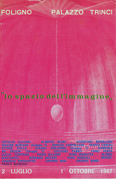 Per qualcuno può essere lo Spazio. Se la mostra sopra menzionata, Lo Spazio dell’Immagine, è considerata epocale, lo è soprattutto per un paio di ragioni: la prima, biecamente storica, è perché “si tratta della prima mostra italiana di opere installate in situ intorno a un unico tema: l’integrazione dello spazio, del colore e dello spettatore in un ambiente totalizzante” (Romy Golan); la seconda è la congerie di fatalità che raduna in un ambiente provinciale alcuni dei più grandi artisti italiani dell’epoca (Foligno è una città umbra, snodo commerciale e ferroviario in recessione economica dopo aver particolarmente patito i bombardamenti alleati del 1944). Senza voler fare un’epica del decentramento, il fatto è che all’epoca la fragorosa mancanza di una rete di istituzioni italiane per l’arte contemporanea lasciava mano molto libera ai molti attori orbitanti attorno ad essa, rendendo episodi simili, ancorché clamorosi, addirittura vantaggiosi (Romy Golan in un articolo per Flash Art[2] ripercorre altre due mostre di quegli anni nate in ambienti provinciali, come Arte povera più azioni povere (1968), agli Arsenali di Amalfi, e Amore mio (1970), a Montepulciano).