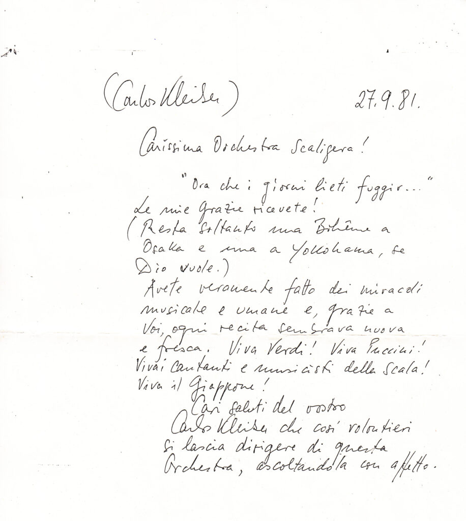 “Carissima Orchestra Scaligera! […] avete veramente fatto dei miracoli musicale e umane (sic) e, grazie a Voi, ogni recita sembrava nuova e fresca. Viva Verdi! Viva Puccini! Viva i cantanti e musicisti della Scala! Viva il Giappone! Cari saluti dal vostro Carlos Kleiber che così volentieri si lascia dirigere di (sic) questa Orchestra, ascoltandola con affetto”.
