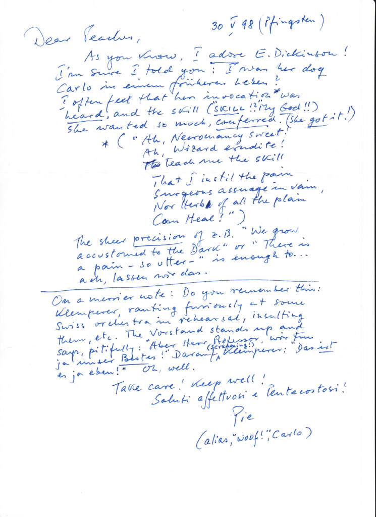 Kleiber in più occasioni aveva confessato la sua profonda ammirazione per Emily Dickinson. Il 30 maggio 1998 (giorno di Pentecoste) dichiara alla sorella di essere stato in una sua vita precedente Carlo, il cane della poetessa americana e saluta così la sorella: “Take care! Keep well! Saluti affettuosi e Pentecostosi! (in italiano nel testo), Pie (alias “woof!” Carlo).”