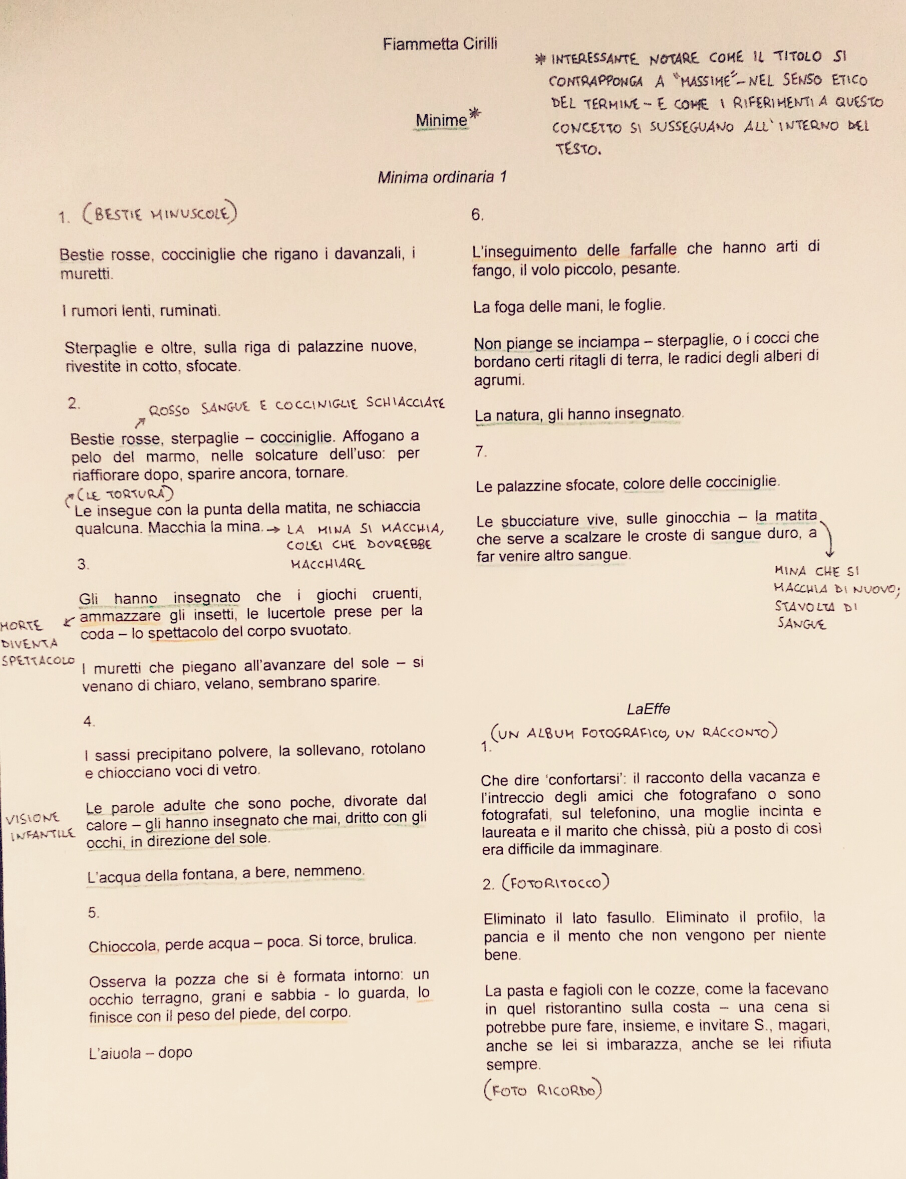 : in Minime Fiammetta Cirilli lavora sugli accenti enfatici ed ellittici, su ciò che ha carattere discontinuo, frammentario, erratico, intermittente, ciò che è fatto di scarti, di rinvii, qualcosa di superfluo rispetto all’economia narrativa, un differimento, una deriva, un’escrescenza, una piega, non facendoli emergere, ma ostendendoli nella loro segmentazione e diffrazione – strutturando altrimenti il testo.
