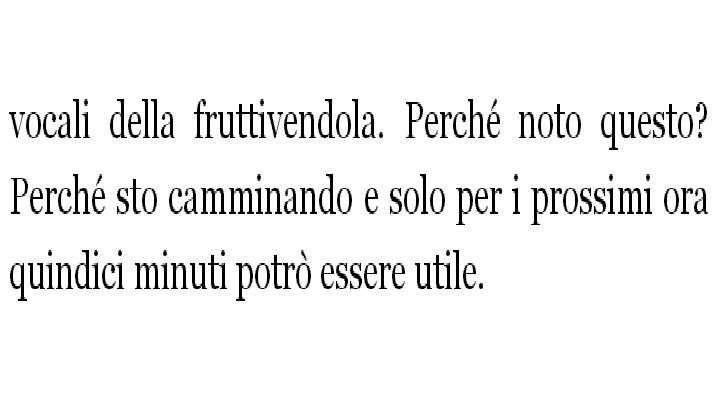 Mi chiedevo cosa sarebbe accaduto all’interno di un corpo che fosse precipitato, se ogni organo per spinta gravitazionale risalisse alla testa. Mi rispondevo urlando, con la testa piena d’uovo, la spina dorsale incrinata, la schiena ancorata alla superficie per nulla liscia del letto adulto. Alza le gambe : cammina, smettila con le domande, falla finita con la decomposizione, accetta la resa. Mi alzavo e tornavo a giocare con Alice sulla spalla destra come un pappagallo.