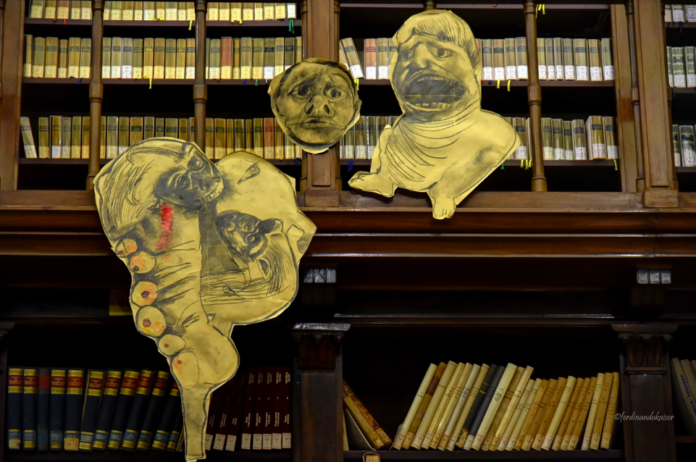 Gli occhi di tutte e tre le teste sono semichiusi. In una, la prima a destra, un viso tozzo, tondo e carnoso con capelli radi e ciglia folte, mi pare di scorgere uno sguardo di rassegnazione. E’ solo un’impressione. Che sguardo è possibile in una testa mozzata? Cosa avranno visto gli occhi in quell’attimo che hanno smesso di vedere? Forse hanno visto il vuoto, magari un soffitto, perché chi ha tagliato la testa agiva da dietro e voleva evitare di essere visto, come in quel quadro di Caravaggio, non quello con la testa del pittore, un altro, memoria aiutami tu.
