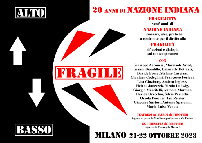 Nazione Indiana ha compiuto vent’anni nel 2023! Siccome non tutti i compleanni sono uguali, Nazione Indiana ha deciso di festeggiare il suo ventennale con due iniziative: nel marzo scorso a Parigi e adesso a Milano, città in cui è nata. Infatti sabato 21 e domenica 22 ottobre si terrà al parco Trotter [al Teatrino e all’ex chiesetta, MM1 Rovereto] FRAGiLiCiTY festa per il ventennale di Nazione Indiana, nella quale redattori e amici di Nazione Indiana discuteranno di alcuni temi significativi nel panorama politico culturale odierno.