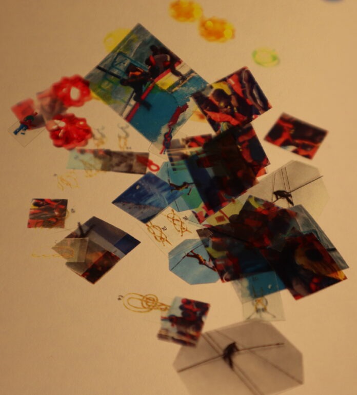 L’immagine mostra il contenuto del caleidoscopio utilizzato per realizzare << Nodi >> (video, 2018): cristalli colorati e ritagli di fotografie di migranti, funamboli, nodi marinari. Il video è stato selezionato per «Lungo-il-confine», Call for artist, 2018, progetto a cura di FUCO Fucina Contemporanea, Pisa 2018. Presentato successivamente a Border/Off, video arte, Le Muratine, Pontassieve 2018, progetto a cura di Serena Becagli.